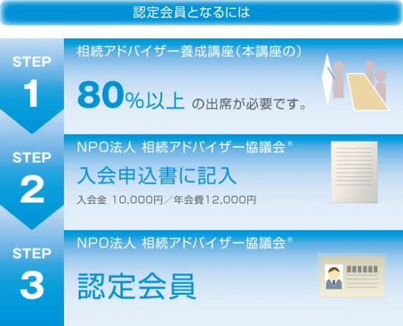 NPO法人 相続アドバイザー協議会®の会員には、「一般会員」と「認定会員」があります。 NPO法人 相続アドバイザー協議会®定款より抜粋 第6条 この法人の会員は、次の2種とし、一般会員および認定会員をもって特定非営利活動促進法(以下「法」という。)上の社員とする。 (1)一般会員 この法人の目的に賛同して入会した個人 (2)認定会員 この法人の目的に賛同し、本会が指定する講座に本会の定める回数以上出席して入会した個人 今すぐ資料請求する